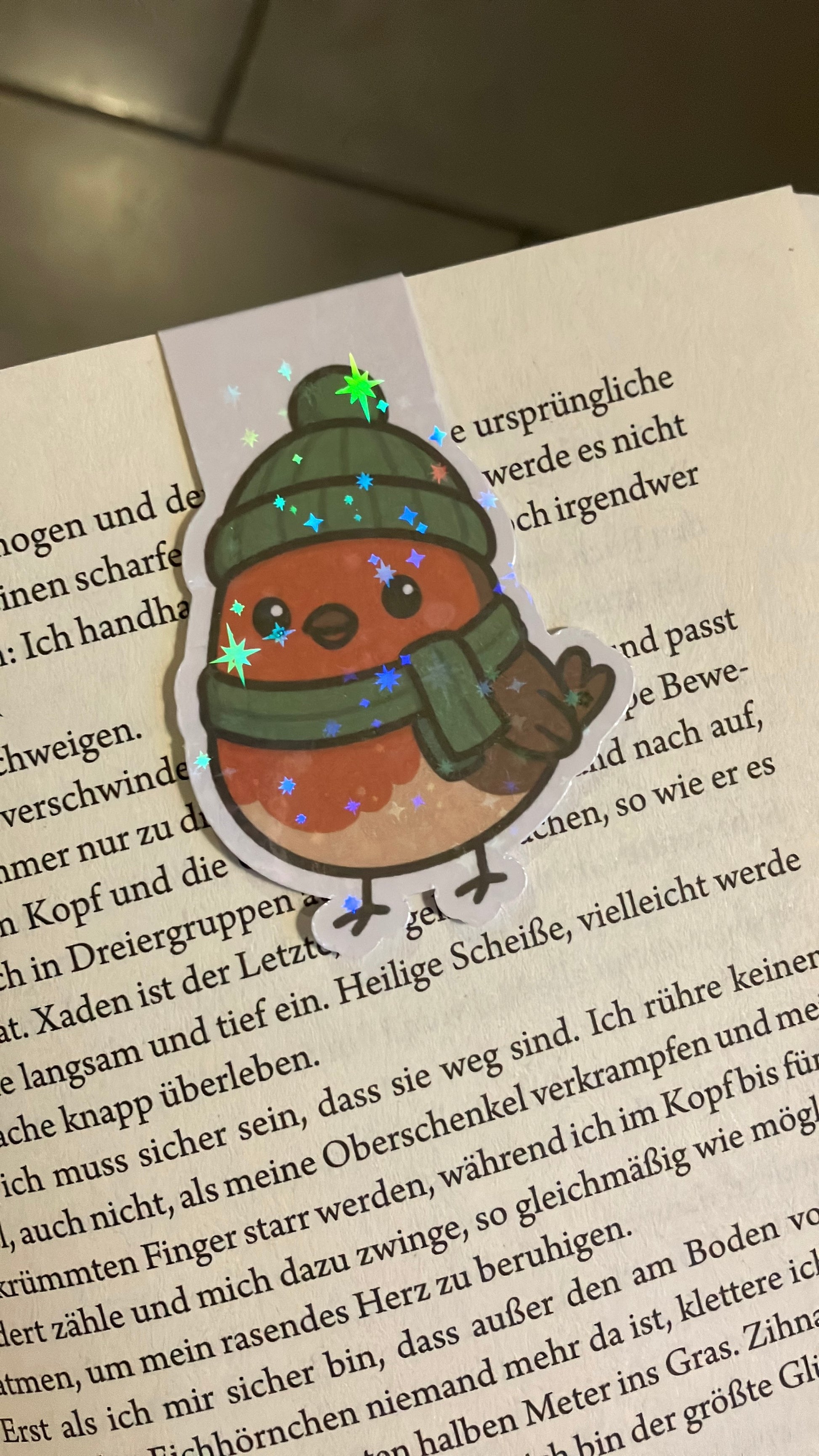 Rotkehlchen im Winterlook als Lesezeichen mit Magnet mit Sternen-Holo Glitzeroptik.